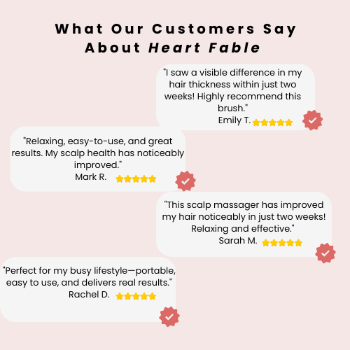 During the first few weeks of using the Heart Fable brush, you'll notice less hair shedding, with each strand appearing thicker and stronger. With consistent use, expect a gradual transformation — sparse areas may appear fuller, scalp health will improve, and your hair's overall vitality will be visibly enhanced.